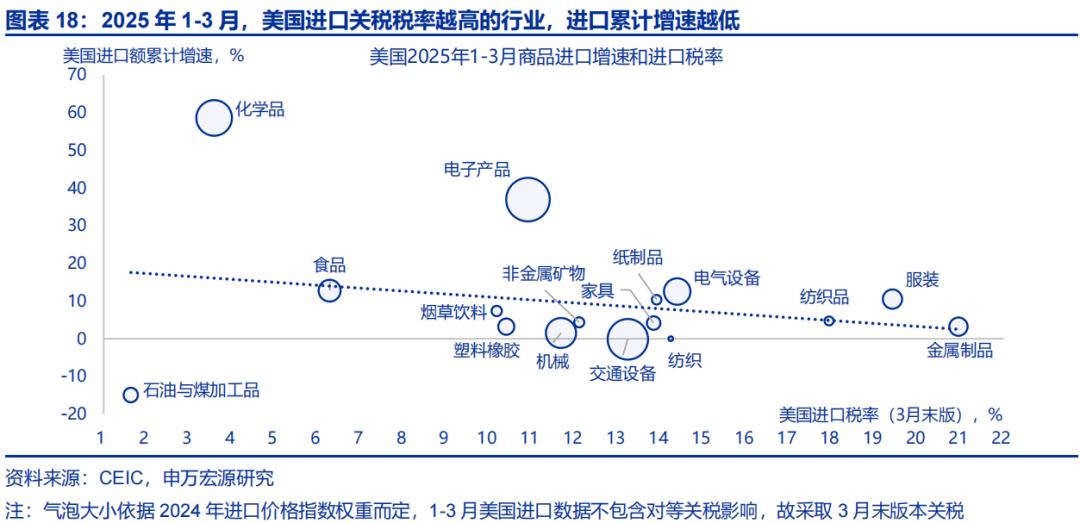美国“抢进口”集中在进口税率较低的行业,如化学品、电子产品(3月末税率)。自2025年以来,美国进口税率越高的行业,进口增速相应更低,显示关税冲击已开始抑制美国进口。进口增速较高的行业主要集中在化学品、电脑电子产品等几个进口税率较低的品类,两者进口累计同比分别达到59%、37%(2025年1-3月)。另一方面,美国进口税率较高的品类进口增速相对更低,如服装、金属制品等。