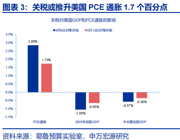 根据5月12日版本关税,美国GDP或下跌0.65个点,通胀抬升1.7个点。预算实验室(The Budget Lab)评估了截至2025年5月12日美国所有关税及外国报复性措施的影响,包括对华关税下调、美英贸易协定和近期宣布的汽车关税退税政策。美国PCE通胀可能抬升1.7个百分点,2025年实际GDP可能下降0.65个点,中长期GDP可能下跌0.36个百分点。分季度看,25年二季度,美国GDP可能下跌0.5个点,三季度-0.2个点,四季度-0.6个点,关税冲击在2026年上半年达到最大。