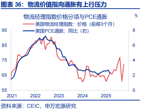 展望未来,美国商品通胀面临较大升温压力,可能抑制居民消费。1)美国Manheim二手车价格指数领先美国车辆通胀2-3个月;2)物流经理价格指数领先美国通胀3个月左右;3)各联储统计的制造业价格指数领先美国通胀约6个月(PPI渠道);4)2025年至今,美国PCE通胀与PCE实际消费呈现负相关关系,凸显“通胀抑制消费”,这一条逻辑在未来可能会继续发酵。