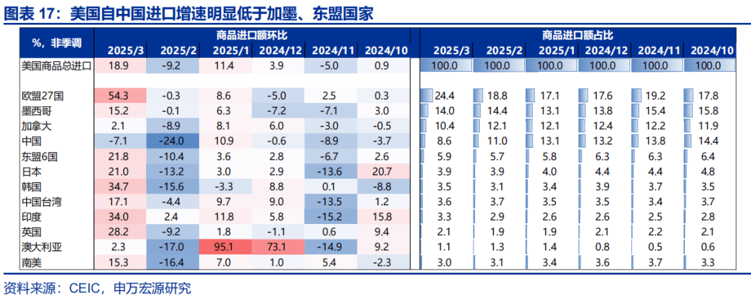 2)从进口数据来看,美国自加墨、东盟进口增速明显强于中国。2025年以来,美国自加拿大、墨西哥、东南亚进口增速明显强于自中国,中国在美国商品进口中的份额大幅收缩,目前已不足10%。