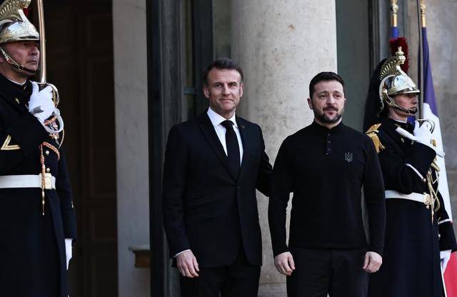 3月26日,法国总统马克龙在巴黎总统府爱丽舍宫迎接到访的乌克兰总统泽连斯基。 新华社记者 高静摄