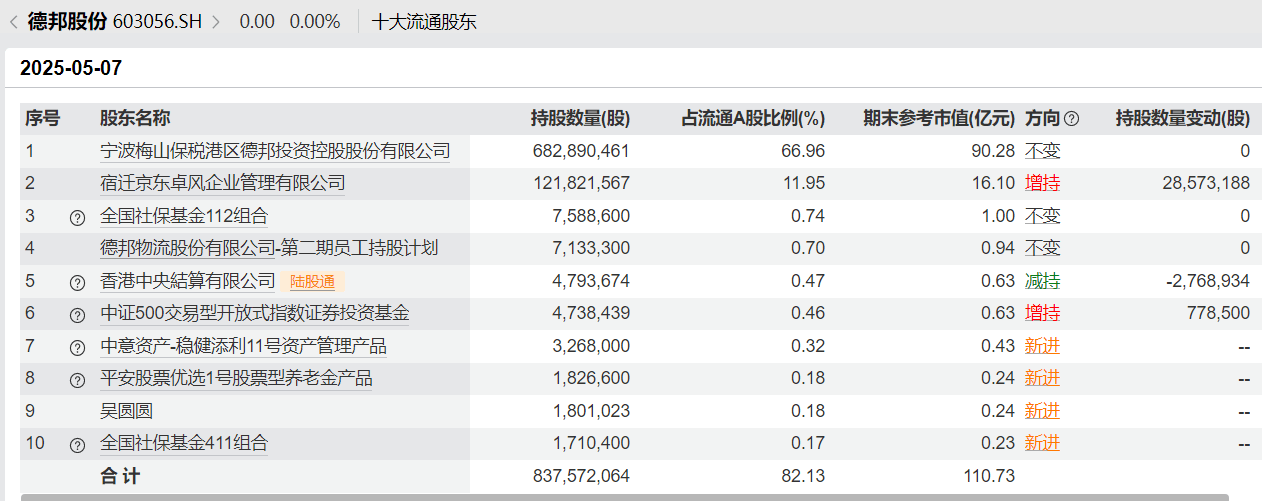 另外,德邦股份截至5月7日的前十大流通股东名单显示,全国社保基金411组合新进前十大,持股数为171万股,排在第10位,还有平安股票优选1号股票型养老金产品也新进前十大,排在第8位。