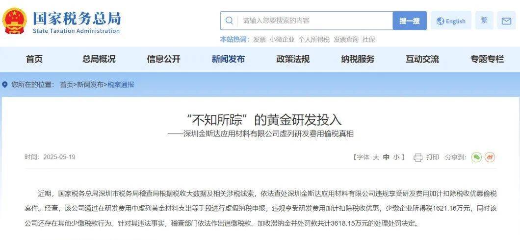 据国家税务总局网站,近期,国家税务总局深圳市税务局稽查局根据税收大数据及相关涉税线索,依法查处深圳金斯达应用材料有限公司违规享受研发费用加计扣除税收优惠偷税案件。