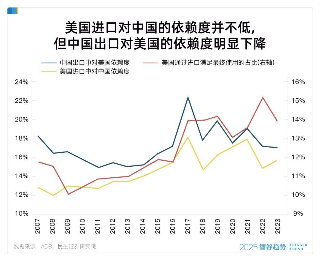 首先,美国对中国的依赖度比中国对美国的依赖度更高。