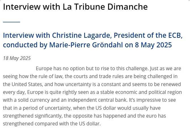 欧洲央行行长拉加德日前接受采访时也表示,近期欧元对美元走强看似有悖直觉,其实源于金融市场对美国失去了信心。这是美国反复无常的关税等政策造成的,“对欧洲来说是一个机遇”。