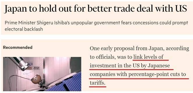 另据报道,考虑到日本是美国最大海外投资来源国,日方除考虑进一步对美开放市场等让步条件外,早期谈判方案中还包括将美国对日商品关税减免的百分点与日本企业在美投资水平挂钩。