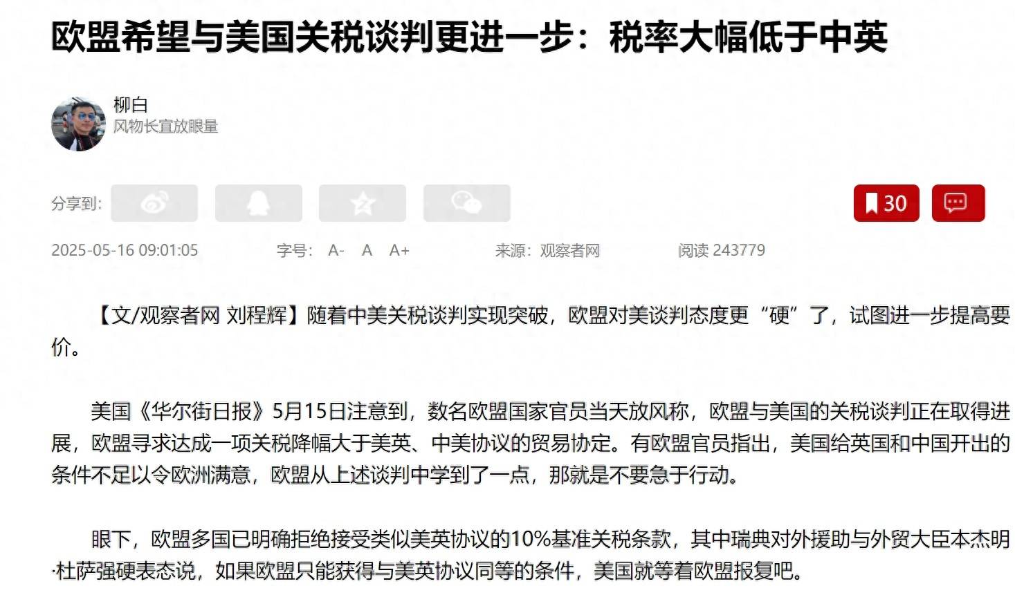 按照欧盟一些官员的说法,现在不急着和美国达成关税协议,既然要谈,就要谈一个比中美以及美英税率更低的关税协议。