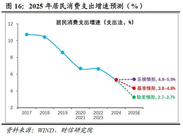 综合以上分析,基准情形下,预计2025年政府消费、居民消费分别增长约6.0%、3.8-4.8%左右,两者合计拉动名义GDP约增长2.5-2.9%,拉动实际GDP增长3.0-3.4%左右(见图17)。对于实际GDP的拉动作用,2025年较2024年提高约1个百分点左右。如果再结合对投资的预判,今年内需对GDP的缓冲作用,在乐观情况下预计在1个百分点左右。