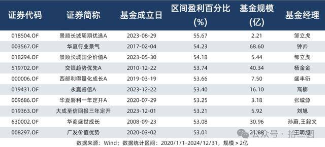 从2020年到2024年,区间盈利百分比最高的10只基金,如图所示。