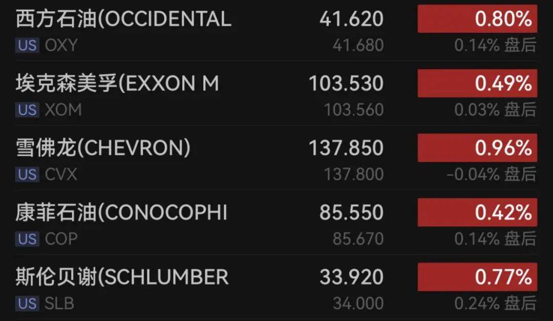 美股能源股普遍上涨,埃克森美孚涨0.49%,雪佛龙涨近1%,康菲石油涨0.42%,斯伦贝谢涨0.77%,西方石油涨0.8%。