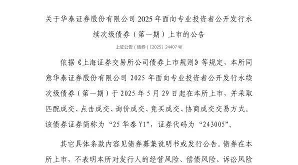 依据《上海证券交易所公司债券上市规则》等规定,上交所同意华泰证券股份有限公司2025年面向专业投资者公开发行永续次级债券(第一期)于2025年5月29日起在上交所上市,并采取匹配成交、点击成交、询价成交、竞买成交、协商成交交易方式。该债券证券简称为“25华泰Y1”,证券代码为“243005”。