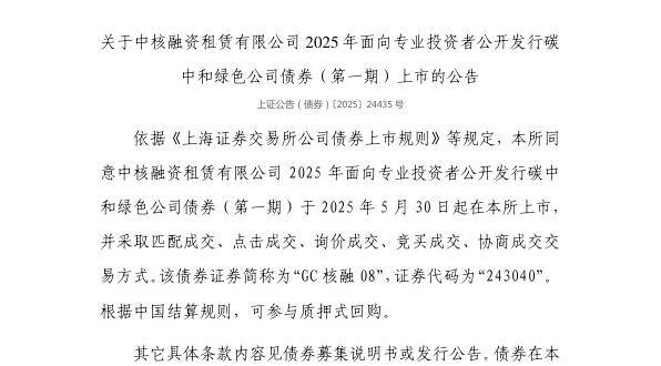 依据《上海证券交易所公司债券上市规则》等规定,上交所同意中核融资租赁有限公司2025年面向专业投资者公开发行碳中和绿色公司债券(第一期)于2025年5月30日起在上交所上市,并采取匹配成交、点击成交、询价成交、竞买成交、协商成交交易方式。该债券证券简称为“GC核融08”,证券代码为“243040”。根据中国结算规则,可参与质押式回购。