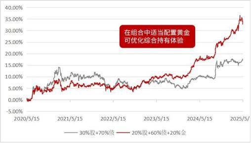 举个例子,按照3:7的比例配置沪深300和中证全债指数,忽略交易成本,近5年组合涨跌幅约为17.14%;如果在组合中适当配置黄金,比如减少股债持仓、用20%仓位投资黄金,那么近5年组合的涨跌幅将提升至33.12%。(指数历史表现不预示未来,不代表相关产品收益。)