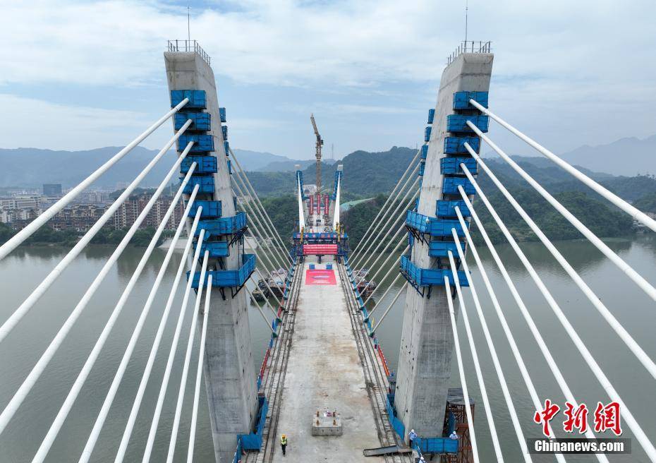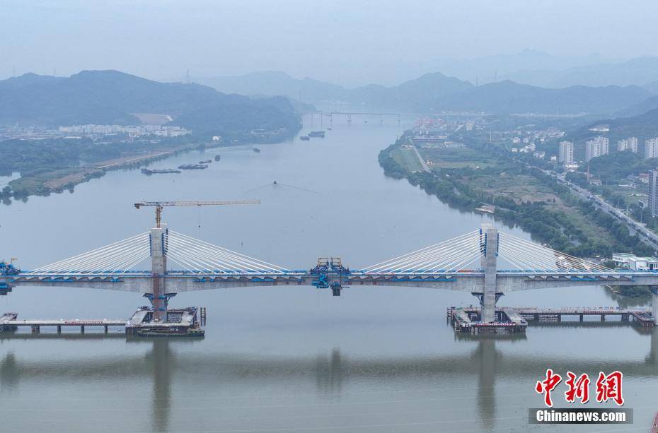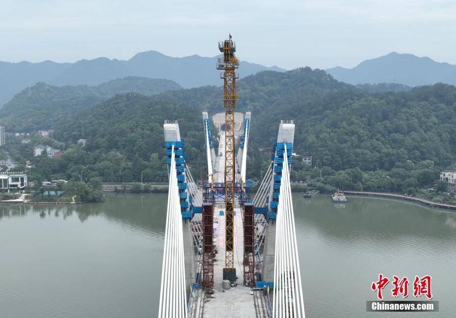 6月4日,新安江特大桥已合龙。当日,位于浙江杭州建德的金建高铁全线控制性工程——新安江特大桥合龙。该桥全长885.2米,主跨216米,是国内跨度最大的塔梁分离、无横撑外倾式矮塔斜拉桥。金建高铁全长64.51公里,设计时速250公里,运营后将联通杭黄高铁、沪昆高铁等线路,串联起“黄山旅游经济圈”“浙中城市群”等多个经济圈。(无人机照片)中新社记者 王刚 摄