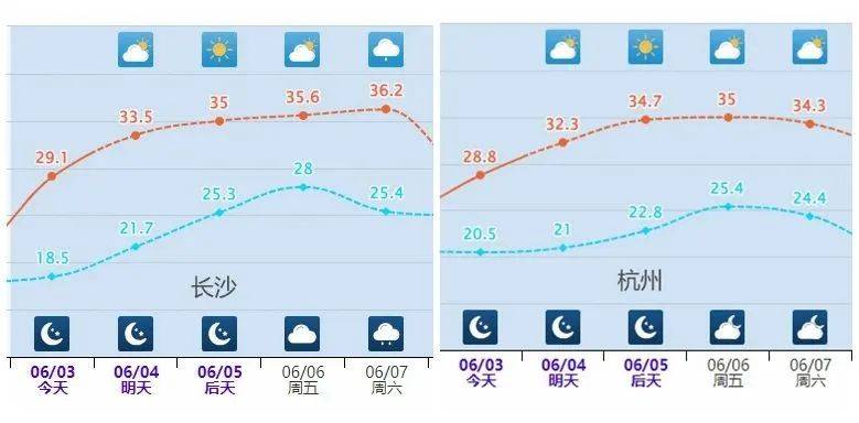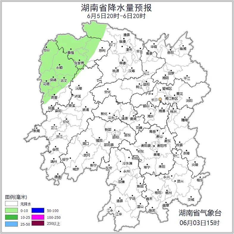 6月5日晚上至6日白天,晴天间多云,湘西州、张家界、常德北部局地有阵雨;南风2~3级;最高气温34~36℃,最低气温21~25℃。