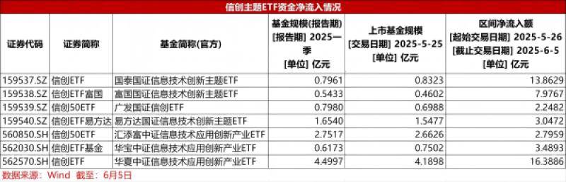 此外,还有易方达国证信息技术创新主题ETF、汇添富中证信息技术应用创新产业ETF、广发国证信创ETF短时间内获得显著资金流入,5月26日到6月5日规模分别增长3.05亿元、2.80亿元、2.25亿元。