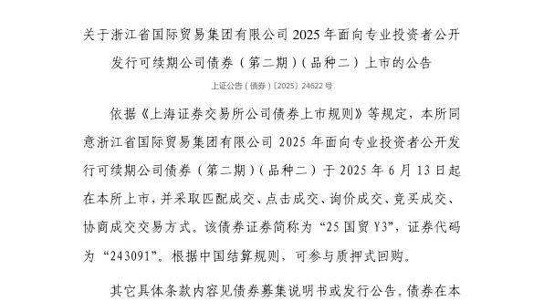 依据《上海证券交易所公司债券上市规则》等规定,上交所同意浙江省国际贸易集团有限公司2025年面向专业投资者公开发行可续期公司债券(第二期)(品种二)于2025年6月13日起在上交所上市,并采取匹配成交、点击成交、询价成交、竞买成交、协商成交交易方式。该债券证券简称为“25国贸Y3”,证券代码为“243091”。根据中国结算规则,可参与质押式回购。