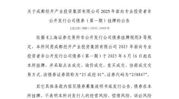 6月13日,上交所发布关于成都经开产业投资集团有限公司2025年面向专业投资者非公开发行公司债券(第一期)挂牌的公告。