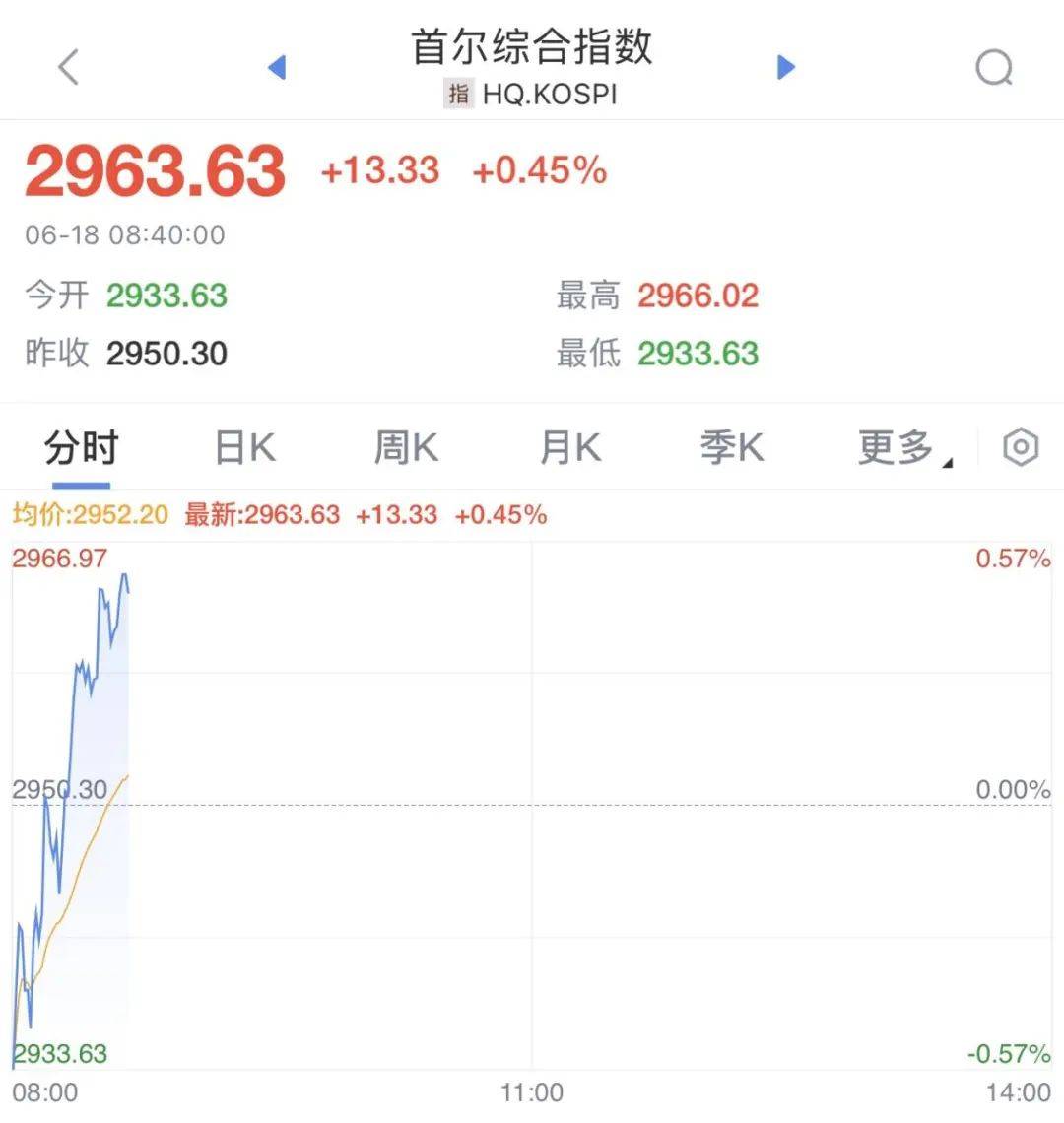 韩国股市同样低开高走,截至发稿,韩国KOSPI指数涨0.45%,至2963.63点。