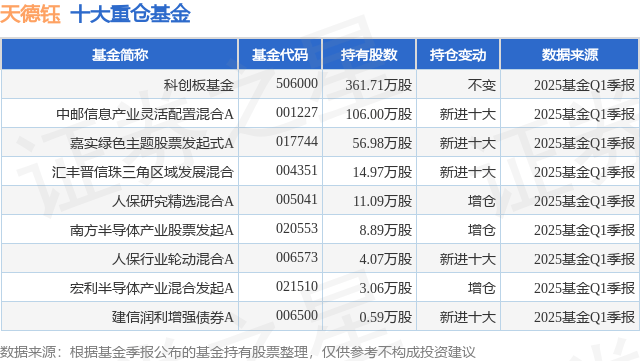 根据2025基金Q1季报公募基金重仓股数据,重仓该股的公募基金共9家,其中持有数量最多的公募基金为南方基金的科创板基金。科创板基金目前规模为18.03亿元,最新净值0.7919(6月17日),较上一交易日下跌0.13%,近一年上涨32.03%。该公募基金现任基金经理为郑晓曦。郑晓曦在任的基金产品包括:南方信息创新混合A,管理时间为2019年6月19日至今,期间收益率为75.89%;南方半导体产业股票发起A,管理时间为2024年4月30日至今,期间收益率为34.05%。