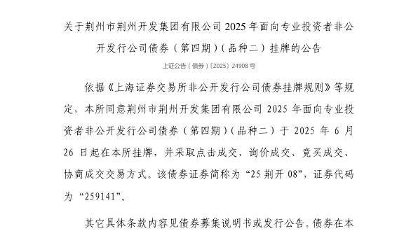 6月25日,上交所发布关于荆州市荆州开发集团有限公司2025年面向专业投资者非公开发行公司债券(第四期)(品种二)挂牌的公告。