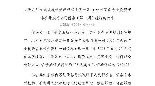 6月25日,上交所发布关于常州市武进建设资产经营有限公司2025年面向专业投资者非公开发行公司债券(第一期)挂牌的公告。