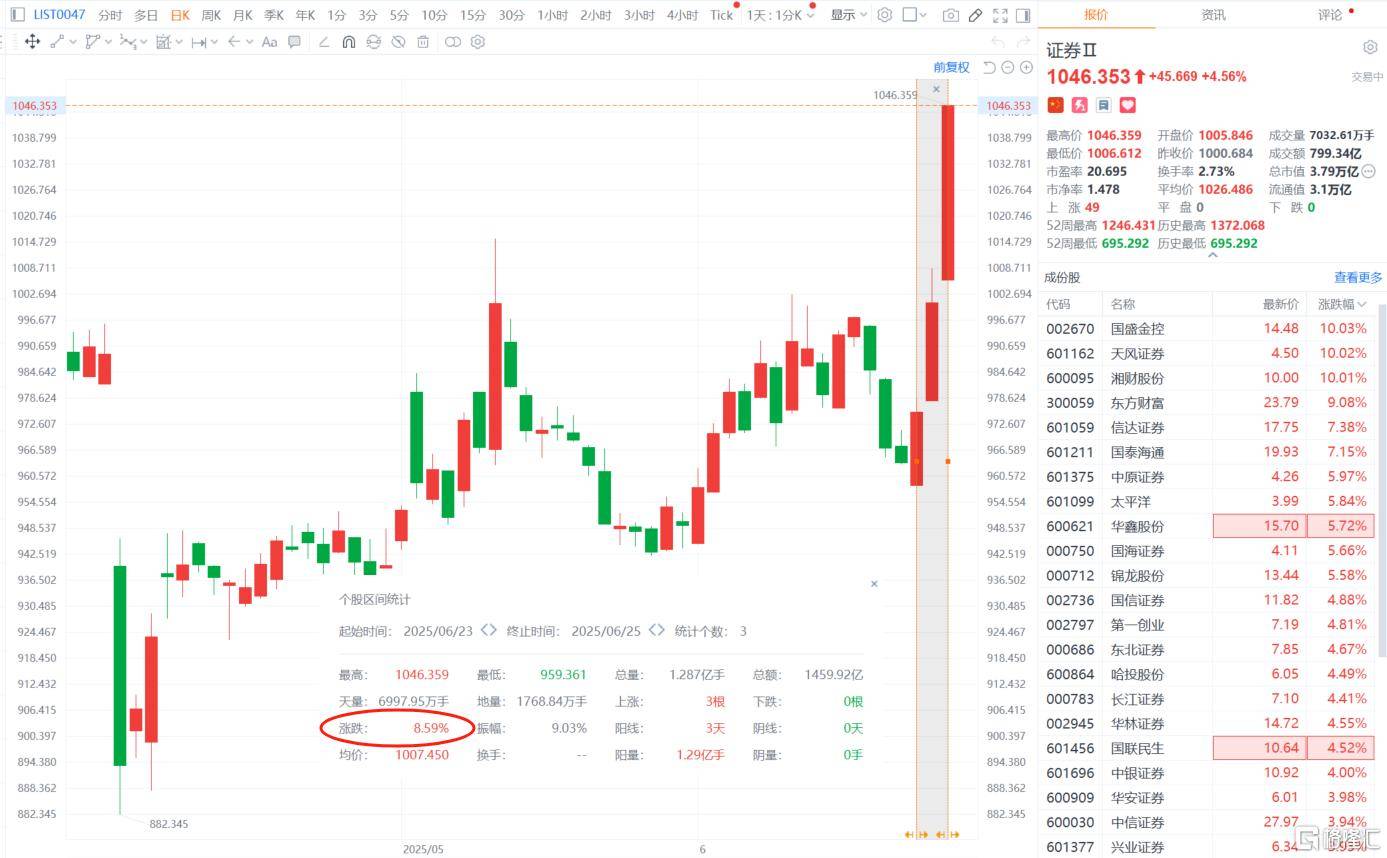 截至发稿,A股国盛金控、湘财股份2连板,天风证券涨停,东方财富大涨超9%,信达证券、国泰海通涨超7%。