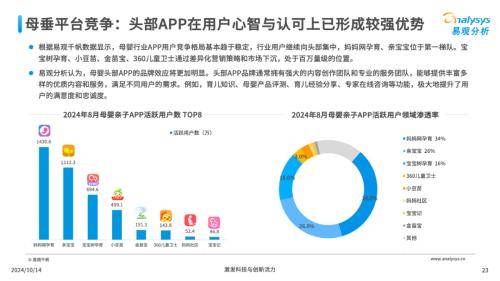 据易观往期相关报告显示,母婴垂直平台的竞争格局已进入稳定期,以妈妈网孕育为代表的头部应用,在用户心智与认可上已形成较强优势。妈妈网孕育APP在月度活跃用户规模、行业活跃渗透等维度均远超同类产品,保持领先。