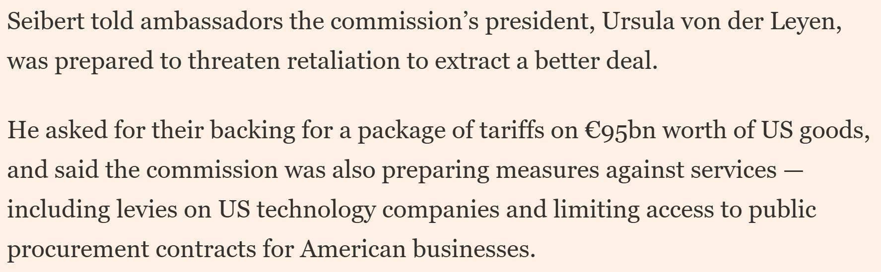 欧盟委员会主席冯德莱恩的办公室主任比约恩·塞伯特日前强调,在最后期限到来之前,欧盟内部须统一立场,随时准备反制美国的关税措施。如果欧盟想达成一项“好协议”,就必须在美国挑起的贸易战中发出“可信的威胁”。