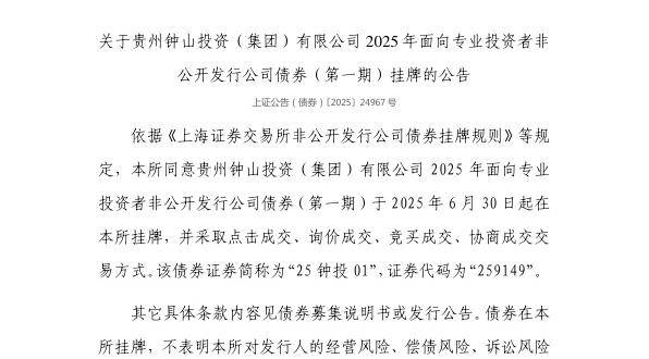 6月27日,上交所发布关于贵州钟山投资(集团)有限公司2025年面向专业投资者非公开发行公司债券(第一期)挂牌的公告。