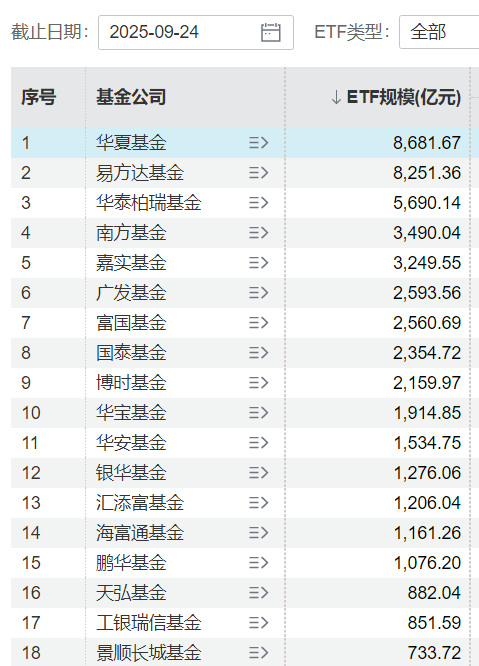 按管理规模排序,前五名分别是:华夏基金、易方达基金、华泰柏瑞、南方基金、嘉实基金,前五最低门槛抬升到3200亿。