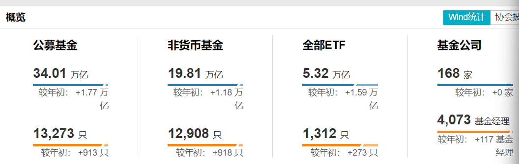 WIND数据显示,截至目前,公募基金管理规模34.01万亿(协会数据35万亿),ETF规模达5.32万亿,较年初增长1.59万亿。