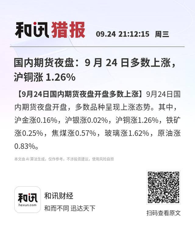 【9月24日国内期货夜盘开盘多数上涨】9月24日国内期货夜盘开盘,多数品种呈现上涨态势。其中,沪金涨0.16%,沪银涨0.02%,沪铜涨1.26%,铁矿涨0.25%,焦煤涨0.57%,玻璃涨1.62%,原油涨0.83%。