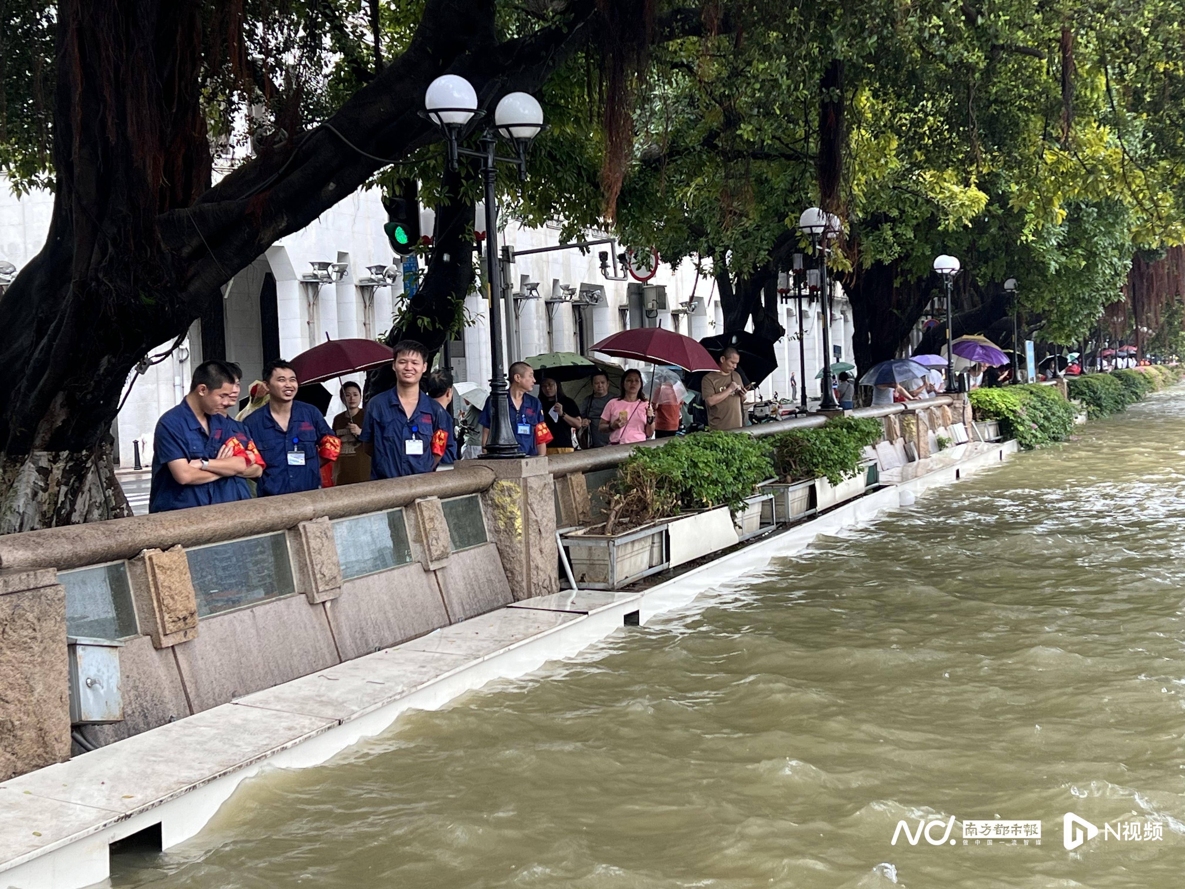 在沿江西路爱群大厦对开,珠江主航道水位非常高,沿线有各个单位派驻的抢险人员值守。