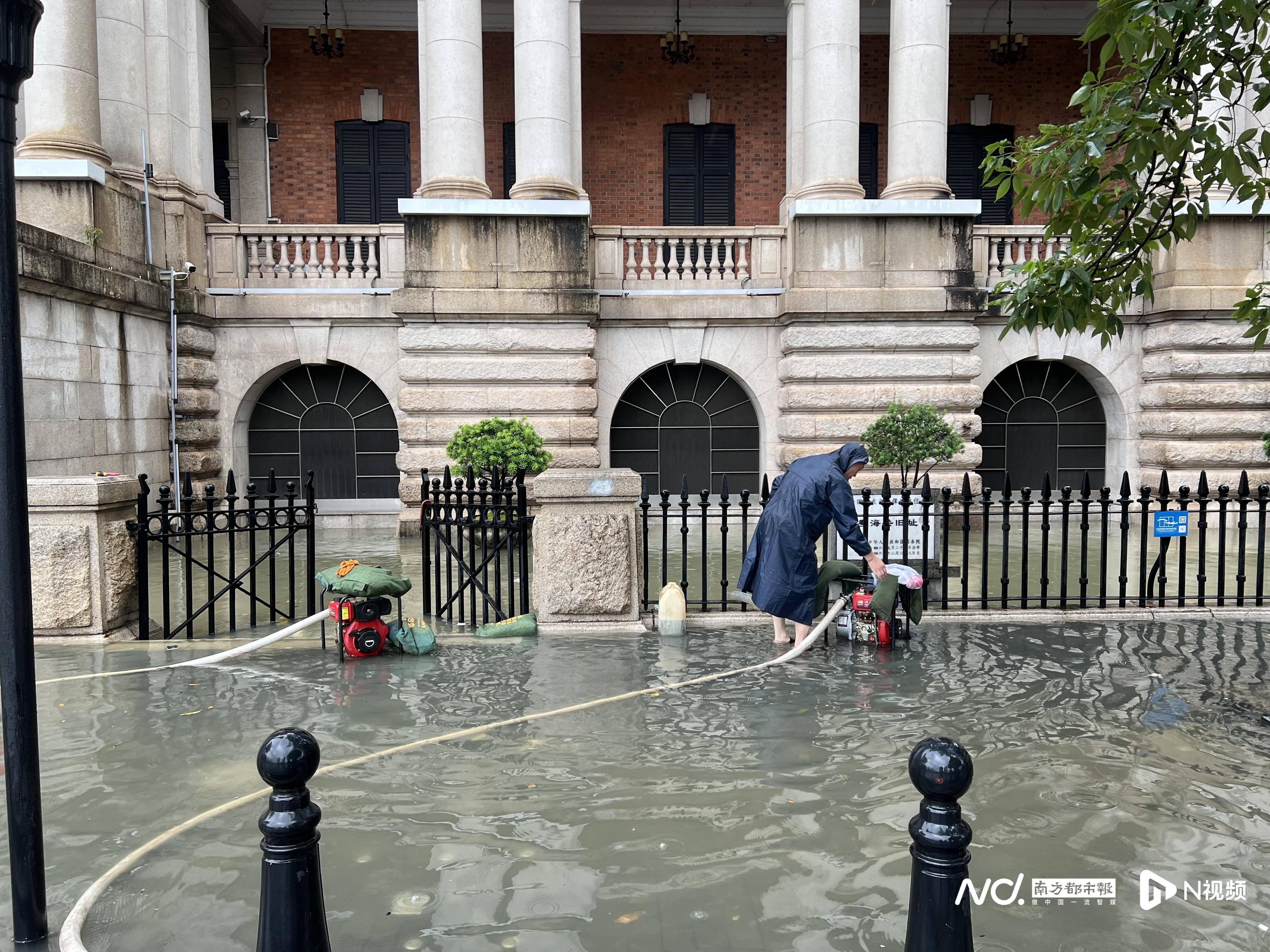 荔湾区沿江西路,广州海关大楼被江水倒灌,地下室和门前小广场泡于水中,有技术工人进行强排作业。