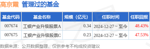 高京霞女士:中国国籍,硕士研究生。2017年加入工银瑞信,现任研究部基金经理。2024年12月27日起担任工银瑞信产业升级股票型证券投资基金基金经理。