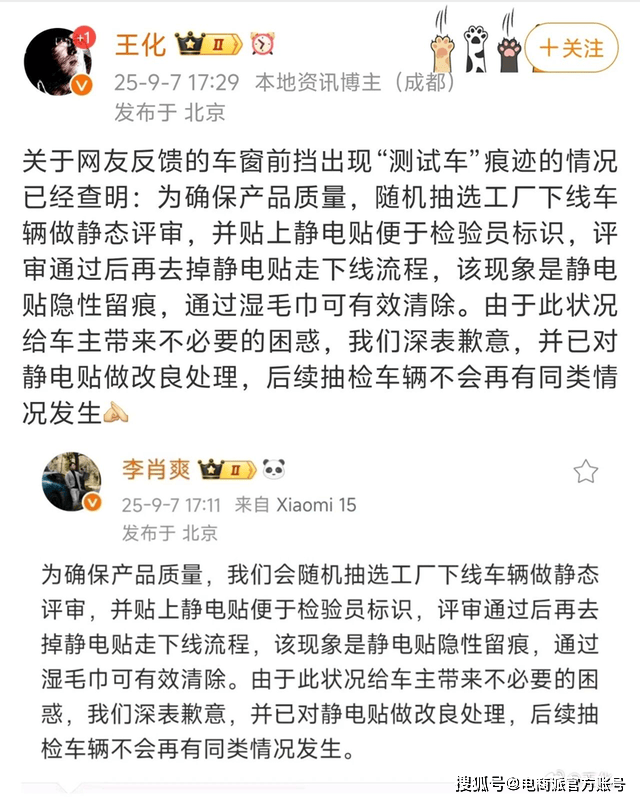 该事件迅速在网上发酵,小米汽车副总裁李肖爽和公关部总经理王化先后在微博上发声回应此事,称“为确保产品质量,随机抽选工厂下线车辆做静态评审,并贴上静电贴便于检验员标识,评审通过后再去掉静电贴走下线流程,该现象是静电贴隐性留痕,通过湿毛巾可有效清除。”