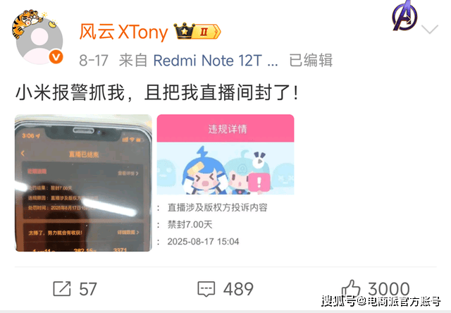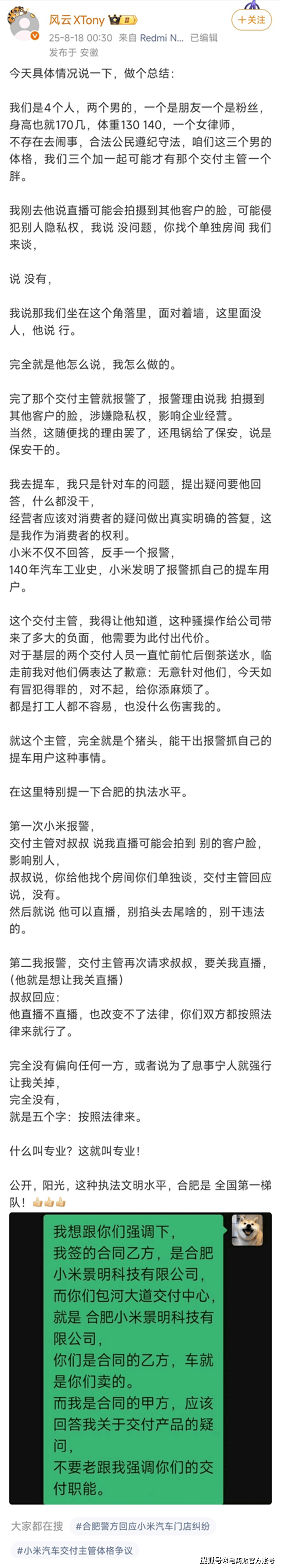8月底,网红作家“风云XTony”突然发微博称,自己去提小米SU7 Ultra新车,但“小米报警抓我,且把我直播间封了!”