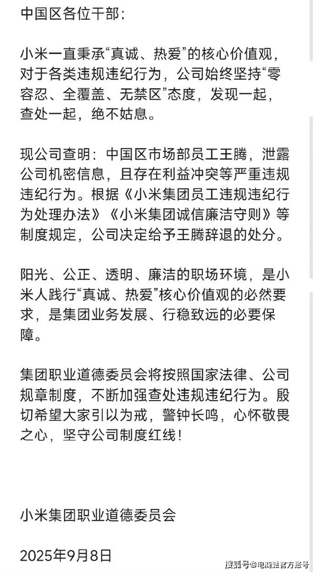 王腾是小米原中国区市场部总经理、REDMI品牌总经理。前段时间,他被曝出已被小米辞退,原因是“泄露公司机密信息,且存在利益冲突等严重违规违纪行为。根据《小米集团员工违规违纪行为处理办法》《小米集团诚信廉洁守则》等制度规定,公司决定给予王腾辞退的处分。”