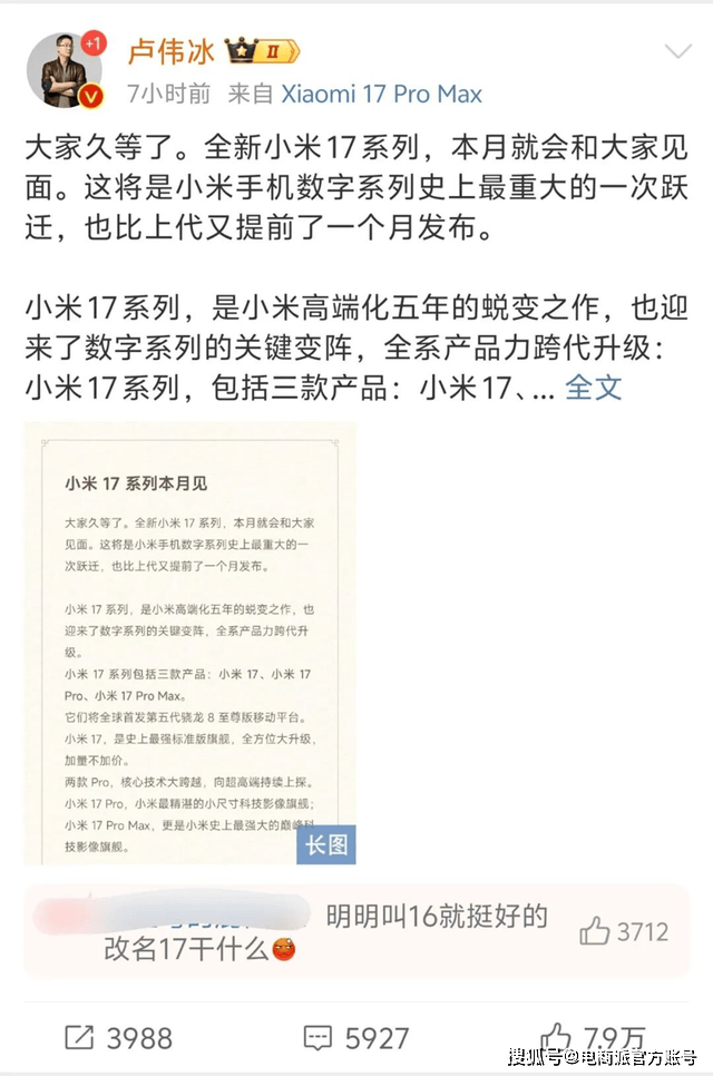 iPhone 17系列发布后不久,小米集团总裁卢伟冰在微博正式官宣:小米17系列将在本月发布,引起轩然大波。因为网传小米今年要出的是16系列,但如今小米却选择跳过16,直接出17,让众多期待小米新机的消费者和科技爱好者深感意外。