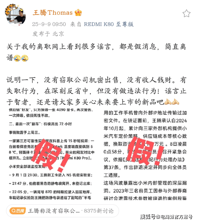 网上流传的信息称,王腾从2024年10月起,多次向三家外部机构提供小米汽车(SU7)定价策略、供应链成本等核心商业机密,累计收受咨询费187万元。对此,王腾表示这些都是假消息,他承认自己存在失职违规的行为,但并没有违法。