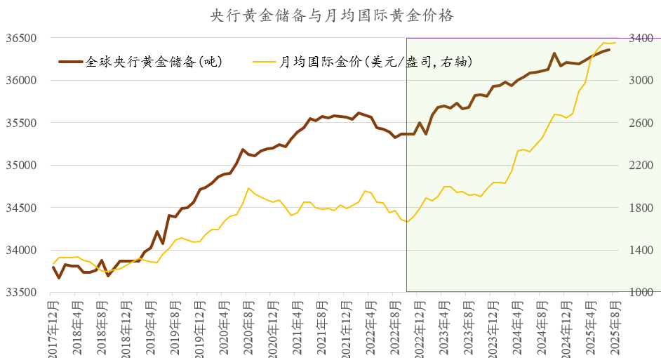请注意,综合上面两个图表,从2024年4月份到现在,黄金ETF持仓规模在持续增长,全球央行的黄金储备也是在持续增长,这意味着什么?