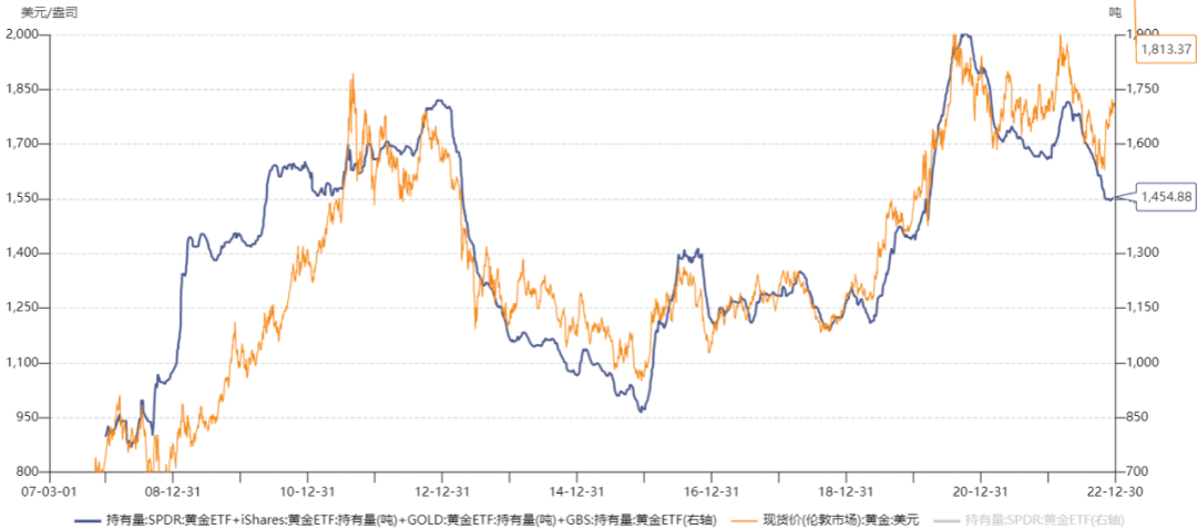 随着一系列黄金ETF的成立,对全球投资者而言,投资黄金变成了一件非常简单的事情。只要拥有美元,在网上开立美股账户,就可以买入黄金实物,由此造成了黄金ETF的规模,某种程度上成为了黄金市场的主导力量,特别是2010年之后,黄金价格几乎与黄金ETF的规模亦步亦趋。