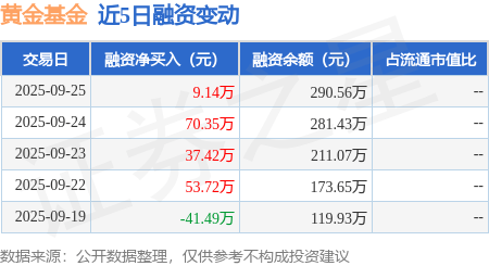 证券之星消息,9月25日,黄金基金(159812)融资买入354.56万元,融资偿还345.43万元,融资净买入9.14万元,融资余额290.56万元,近3个交易日已连续净买入累计116.91万元。