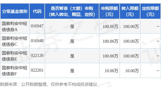 证券之星消息,9月26日国泰基金管理有限公司发布《关于国泰利安中短债债券型证券投资基金暂停大额申购、定期定额投资及转换转入业务的公告》。公告中提示,为维护基金份额持有人的利益,自2025年9月30日起国泰利安中短债债券型证券投资基金暂停大额申购、定期定额投资及转换转入业务,下属分级基金调整明细如下: