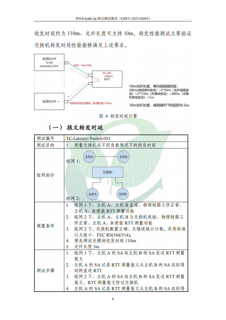 转发性能测试聚焦时延核心指标。通过直连与过交换机的RTT对比测量,交换机在无负载与有负载场景下的转发时延分别为466.5ns与469ns,均低于480ns目标值。结合端侧PAXI单向收发<200ns、光模块时延110ns及光纤链路时延,端到端RTT可控制在2us以内,满足scale-up域互联时延要求。
