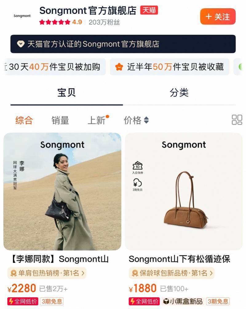 而山下有松作为近年来崛起的本土设计师品牌包袋代表,凭借其独特的东方美学设计和亲民高质的定价,迅速在市场中占据一席之地。品牌价格集中在千元档位,瞄准追求设计感与实用性兼具的年轻都市消费者。尽管山下有松未公开具体营收数据,但2024年该品牌在天猫渠道的销售额近5亿元,去年双11销售额位列箱包榜第二(国产箱包品牌第一)。虽然从定位来看,LV与山下有松的竞争关系并不强。LV是传统奢侈品,山下有松勉强挨着“轻奢”的边。