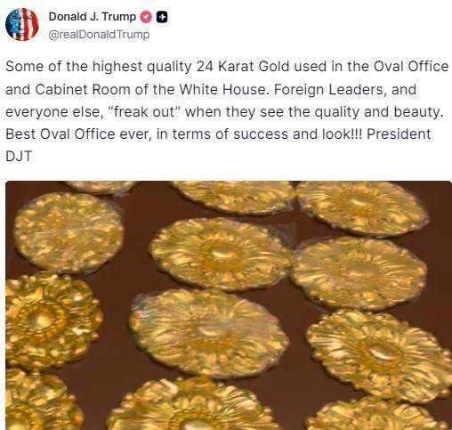 特朗普写道,“白宫椭圆形办公室和内阁会议室使用了品质最高的24K黄金。外国领导人以及其他人在看到其品质与精美程度后都‘惊叹不已’”。