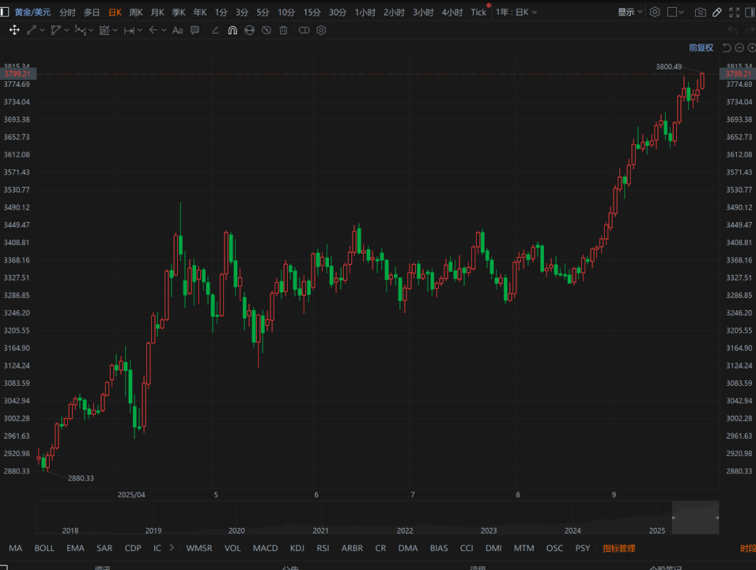 现货黄金突破3800美元/盎司,续创历史新高,日内涨超1%。今年以来累计上涨近45%。