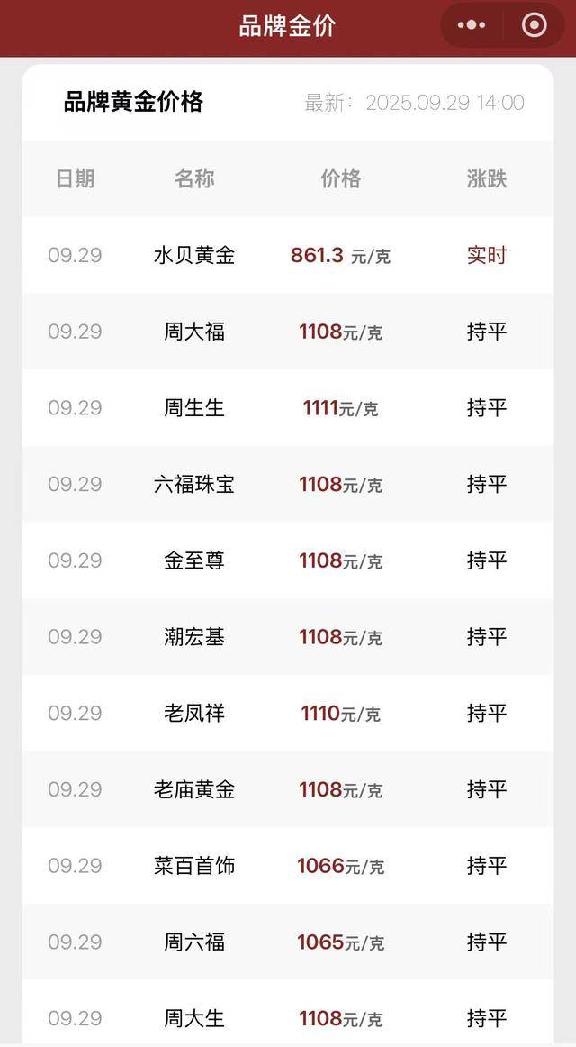 现货黄金走高的同时,国内金饰价格也屡创新高。根据今日金价小程序,截至9月29日,国内金饰克价悉数站上1100元。周生生金饰价格为1111元/克,周大福、潮宏基、老庙黄金、六福珠宝等均为1108元/克。